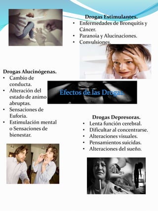 Este documento resume los efectos de tres tipos de drogas en el cuerpo humano. Las drogas estimulantes pueden causar enfermedades como bronquitis y cáncer, así como paranoia y alucinaciones. Las drogas depresoras llevan a una función cerebral lenta, dificultades para concentrarse, alteraciones visuales y pensamientos suicidas. Las drogas alucinógenas cambian la conducta y el estado de ánimo de forma abrupta, y pueden causar euforia, estimulación mental o sensaciones de bienestar.