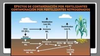 Los compuestos nitrogenados son importantes para los seres vivos pero su exceso en el ambiente puede causar problemas. El nitrógeno es necesario para las proteínas pero los fertilizantes han aumentado los nitratos en el agua, causando eutrofización y riesgos a la salud como metahemoglobinemia y cáncer. La contaminación por fertilizantes es una amenaza para los ecosistemas acuáticos.