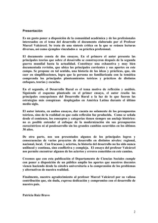 Este documento presenta una revisión de los principales enfoques teóricos sobre el desarrollo desde la posguerra hasta la actualidad. Comienza describiendo la emergencia del concepto de desarrollo y luego resume los enfoques de la modernización, la dependencia, las necesidades básicas, el desarrollo humano y el postdesarrollo. El autor analiza la evolución de estas teorías y cómo respondieron a los cambios históricos y de contexto a nivel mundial. El objetivo es proporcionar una comprensión de la tray