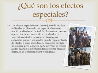 Los efectos especiales son técnicas utilizadas en el entretenimiento para crear efectos que serían demasiado caros o peligrosos de lograr de forma natural. Los principales tipos de efectos especiales son efectos ópticos (manipulación de imágenes), efectos mecánicos, efectos de sonido, maquillaje y efectos digitales.