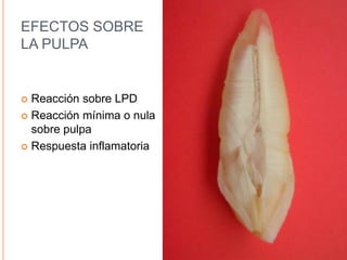 Este documento describe los efectos perjudiciales potenciales de las fuerzas ortodóncicas sobre la pulpa, las raíces dentales y la altura alveolar. Las fuerzas intensas o bruscas pueden causar dolor o daño a la pulpa, mientras que los movimientos dentales pueden conducir a la remodelación de hueso, cemento y dentina. En general, los cambios en la longitud radicular y la altura alveolar son mínimos con el tratamiento ortodóncico.
