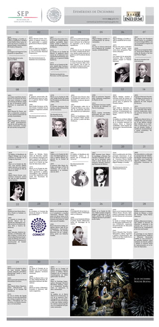 Este documento presenta una lista de fechas y eventos importantes que ocurrieron en diciembre en México. Entre los eventos destacados se encuentran la proclamación de la independencia de México por Miguel Hidalgo en 1810, la firma del Plan de Ayala entre Villa y Zapata en 1914, y el nacimiento de destacados personajes mexicanos como Diego Rivera en 1886 y Salvador Novo en 1904. El documento provee información concisa sobre acontecimientos políticos, sociales y culturales relevantes en la historia de México ocurridos en