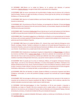 El documento resume varios eventos históricos importantes de México ocurridos entre el 3 de diciembre y el 21 de diciembre, incluyendo la muerte de Fray Servando Teresa de Mier el 3 de diciembre de 1827, la promulgación de la Ley del Seguro Social el 3 de diciembre de 1942, y la fundación de Tenochtitlan el 12 de diciembre de 1325.