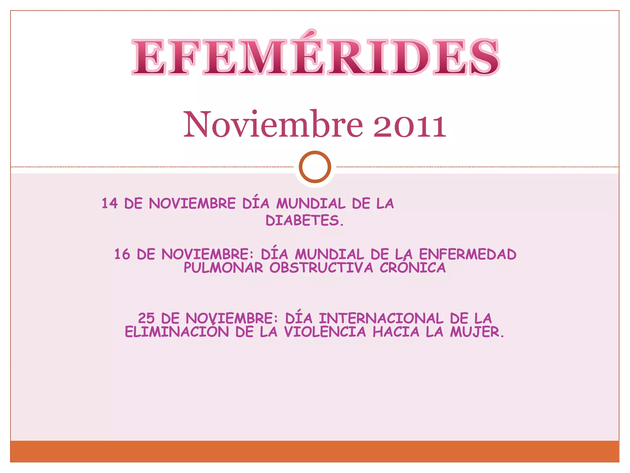 Este documento enumera tres días mundiales que ocurren en noviembre de 2011: el 14 de noviembre es el Día Mundial de la Diabetes, el 16 de noviembre es el Día Mundial de la Enfermedad Pulmonar Obstructiva Crónica, y el 25 de noviembre es el Día Internacional de la Eliminación de la Violencia hacia la Mujer.