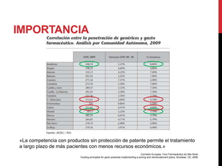 El documento aborda la importancia de los medicamentos genéricos, destacando su capacidad para proporcionar tratamientos a largo plazo a más pacientes con menos recursos. Se explican conceptos clave como bioequivalencia y equivalencia farmacológica, así como las barreras de entrada y prácticas anticompetitivas que enfrentan los genéricos en la Unión Europea. Además, se analizan los estudios de bioequivalencia y se proporciona información sobre el reglamento y la legislación relacionada con el uso de estos medicamentos.