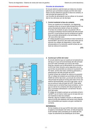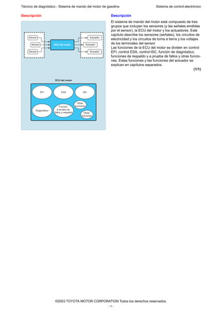 El documento describe el sistema de control electrónico del motor de gasolina, incluyendo los sensores, la unidad de control electrónico (ECU) y los actuadores. Se explican los circuitos eléctricos de alimentación y toma de tierra de la ECU, así como los diferentes tipos de señales de los sensores, como el caudalímetro de aire. Además, se detallan los dos métodos principales para controlar el relé principal de la EFI a través de la llave de contacto o mediante la ECU.