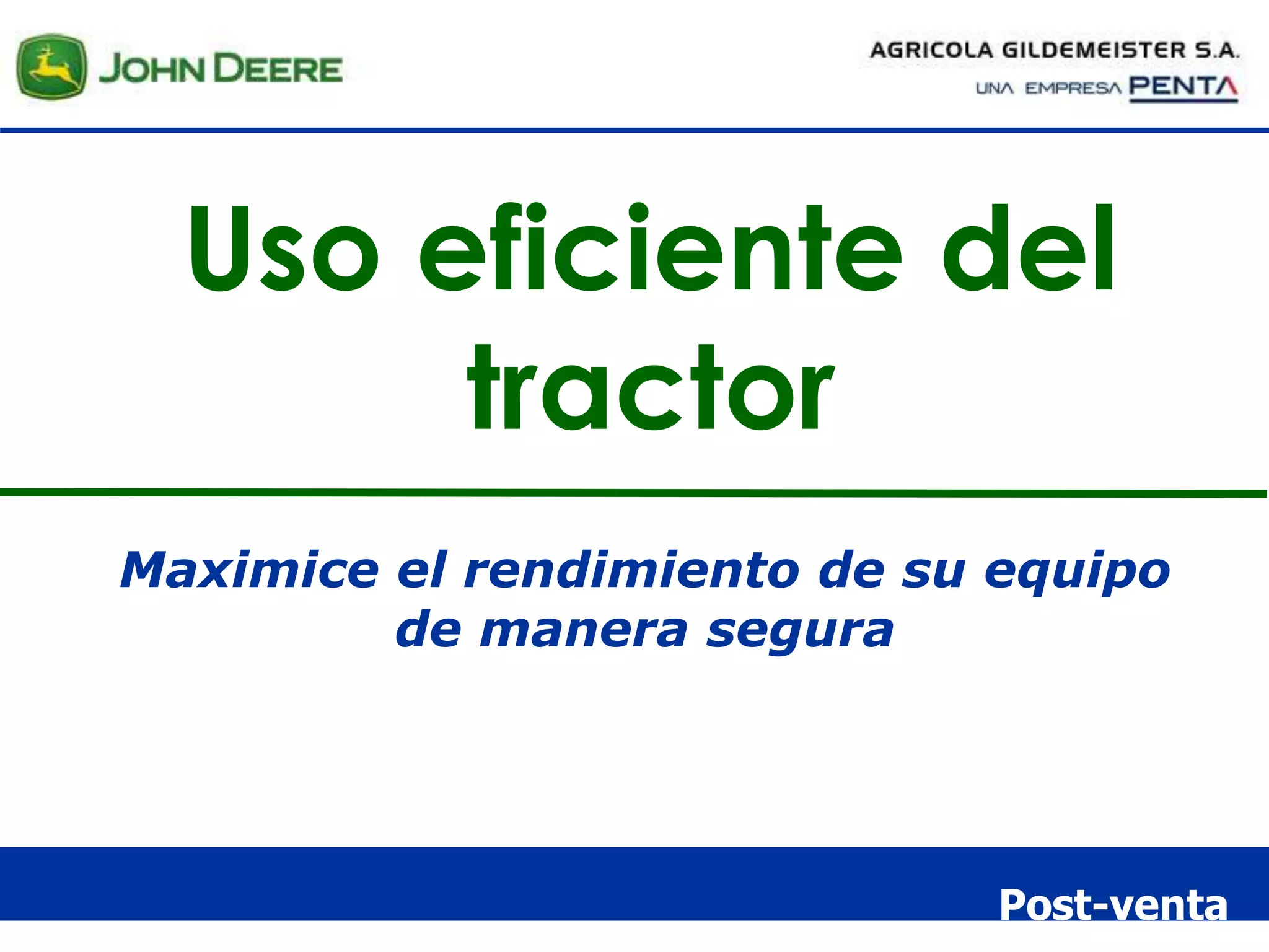 El documento describe formas de maximizar el rendimiento de los tractores de manera segura y eficiente. Explica que el uso eficiente del tractor mejora el rendimiento con menos combustible, alarga la vida útil del equipo y mejora el control de costos. Recomienda utilizar la doble tracción, contrapesar adecuadamente el tractor, inflar los neumáticos correctamente y seleccionar la marcha de trabajo apropiada para cada tarea.