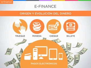 El paso de la economía tradicional a la economía digital ha sido posible con la revolución de internet, y como consecuencia los modelos de negocio han evolucionado por el desarrollo de nuevas tecnologías, nuevas formas de intercambio, o bien, el uso de nuevas unidades de cambio o monedas digitales. La introducción de los avances en tecnología de la información se ha dado en prácticamente todos los sectores de la economía. En el caso particular de la industria financiera, dicho fenómeno ha dado lugar a la acuñación del término “e-finance”. Este término se refiere a la aplicación de las tecnologías de procesamiento de datos a tecnologías de la información financiera. A continuación se presenta un informe relacionado con las definiciones y aplicaciones del “e-finance” y todos los componentes tecnológicos que surgen a partir del mismo. En primer lugar se habla de la evolución del dinero hasta llegar al dinero digital, las monedas virtuales, los monederos electrónicos y las pasarelas de pago.