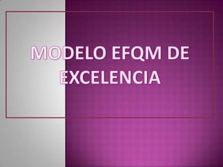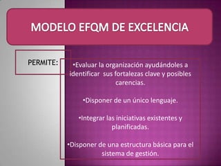 El modelo EFQM de excelencia proporciona una estructura para evaluar una organización y mejorar su rendimiento. Se centra en 9 áreas clave: liderazgo, estrategia, personas, alianzas y recursos, procesos, clientes, personas, sociedad y resultados clave. El modelo ayuda a identificar fortalezas, áreas de mejora y a alinear iniciativas para lograr resultados excelentes.