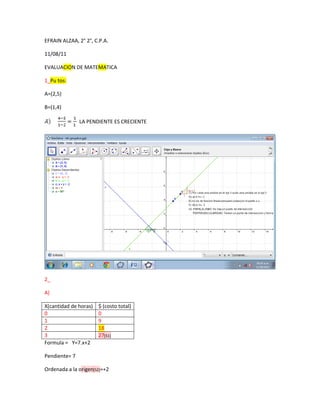 1. El documento presenta dos actividades de evaluación de matemática. La primera actividad pide calcular la pendiente de una recta, dibujarla en Geogebra, y dibujar otras rectas paralelas y perpendiculares. La segunda actividad pide completar una tabla de valores, expresar la fórmula correspondiente indicando su pendiente y ordenada al origen, y graficarla en Geogebra realizando un análisis de la gráfica. El estudiante obtuvo 18 puntos de un total de 21.
