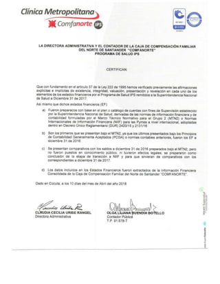 El documento presenta el estado de situación financiera comparativo de una clínica entre 2017 y 2016. Los principales activos son cuentas por cobrar y propiedades, planta y equipo. Los pasivos más importantes son cuentas por pagar y beneficios a empleados. El patrimonio aumentó levemente. Los ingresos disminuyeron un 57% principalmente por menores ingresos de prestación de servicios de salud. Los costos y gastos también bajaron un 61%. El resultado del ejercicio fue una pérdida menor en 2017 que en 2016.
