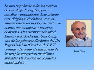 Este documento describe el protocolo básico de las Técnicas para la Libertad Emocional (EFT). Consiste en 10 pasos que incluyen identificar un problema emocional, evaluar su intensidad, crear frases para trabajar el problema, estimular puntos meridianos mientras se repiten las frases, realizar ejercicios cerebrales y volver a estimular los puntos y reevaluar la intensidad del problema. El objetivo es equilibrar el sistema energético para liberar emociones negativas de manera sencilla y efectiva.
