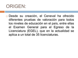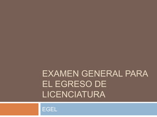 El documento describe el Examen General para el Egreso de Licenciatura (EGEL), un examen aplicado por el Ceneval a 35 licenciaturas para evaluar los conocimientos y habilidades de los egresados. Se formula a través de la opinión de directores, expertos y egresados, y cubre contenidos determinados por un consejo de especialistas. Su función es identificar si los egresados están preparados para ejercer su profesión de manera competente.