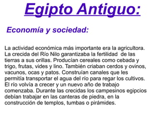 La economía de Egipto Antiguo dependía principalmente de la agricultura, que florecía gracias a las crecidas anuales del Río Nilo. Los egipcios cultivaban granos, frutas y lino, y criaban ganado. Durante las inundaciones, los campesinos trabajaban en obras como canteras, templos y pirámides. Las pirámides servían como templos o tumbas para los faraones, y su tamaño reflejaba los años que gobernó cada faraón. La religión egipcia era politeísta