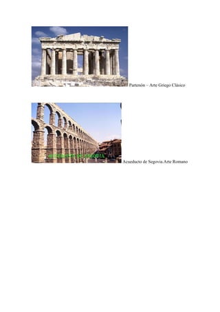 El documento presenta una línea de tiempo que resume los principales estilos artísticos desde el 3000 a.C. hasta el Renacimiento, incluyendo el arte egipcio antiguo, el arte griego clásico, el arte romano, el arte bizantino y el arte gótico.