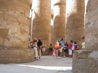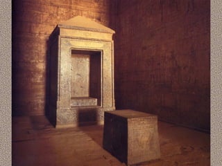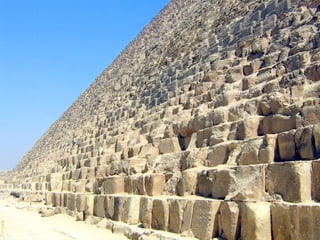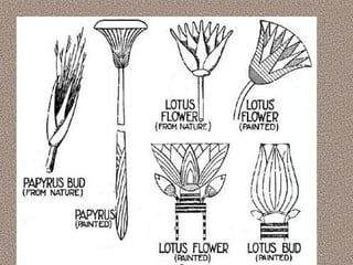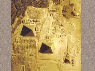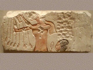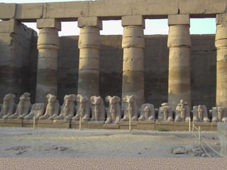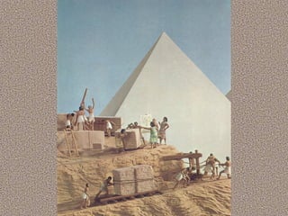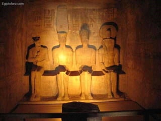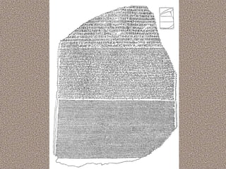 El documento resume la historia y cultura de Egipto entre 4000-500 a.C. Los faraones unificaron el país y construyeron impresionantes obras arquitectónicas como las mastabas, pirámides y templos. El arte egipcio se caracterizó por figuras frontales sin expresión o movimiento que representaban la jerarquía. La escritura egipcia fue descifrada gracias a la Piedra Rosetta.