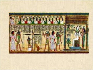 El documento describe la civilización del antiguo Egipto. Los egipcios dependían del río Nilo, que fertilizaba sus cultivos y era su principal vía de transporte. Desarrollaron avanzadas matemáticas, astronomía y su propio sistema de escritura jeroglífica. Creían en muchos dioses y construyeron impresionantes pirámides y templos para enterrar a sus faraones y rendir culto a los dioses. El faraón gobernaba con poder absoluto sobre la compleja sociedad egipcia.