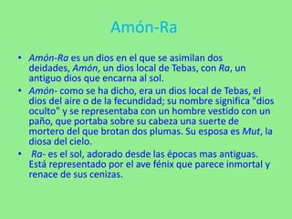 El documento resume varios dioses importantes de la mitología egipcia antigua, incluyendo Amón-Ra como una deidad combinada del dios local de Tebas Amón y el antiguo dios sol Ra; Horus como un poderoso dios celeste representado con forma de halcón; Anubis como el dios de la muerte representado con cabeza de perro; e Isis y Osiris como dioses asociados con la fertilidad, la resurrección y el juicio de los muertos.