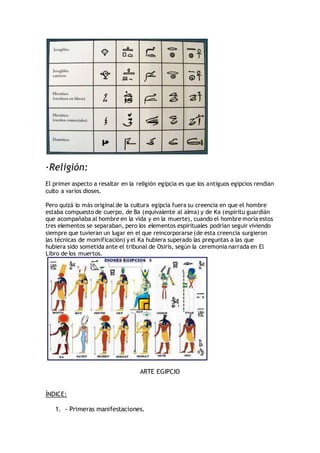La sociedad egipcia estaba altamente jerarquizada, dividida entre el faraón en la cima y los prisioneros de guerra en la base. El faraón era el representante del dios Horus en la tierra. Los sacerdotes se dedicaban a los dioses a cambio de tierras e ingresos, mientras que el ejército dependía del faraón. La cultura egipcia se destacaba por su religión y escritura, incluida la escritura jeroglífica descifrada en el siglo XIX que utilizaban en templos y tumb