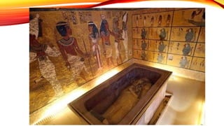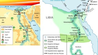 El documento describe varios aspectos clave de la civilización egipcia antigua, incluyendo la Pirámide de Keops en Guiza, la ciudad de Tell-el-Amarna fundada por Akenatón para rendir culto al dios Atón, la planificación urbana de Akhetaton dividida en tres sectores, el templo de Karnak en Tebas, y el Valle de los Reyes que alberga tumbas reales como la de Tutankhamón.