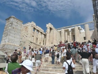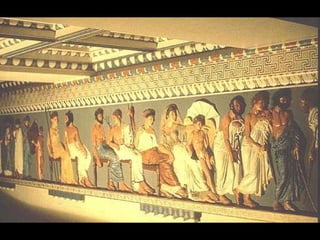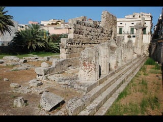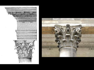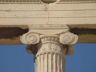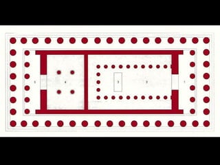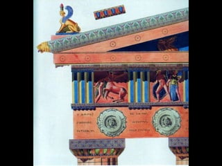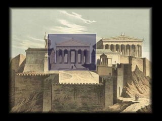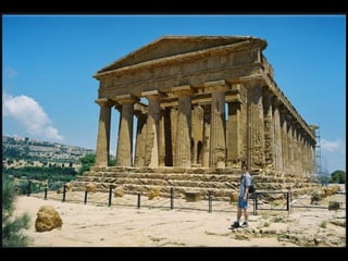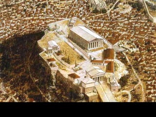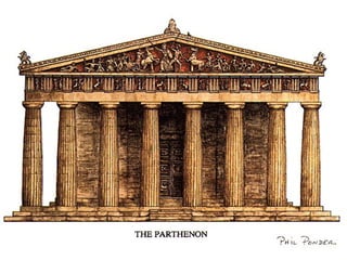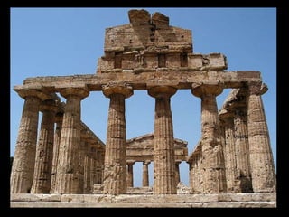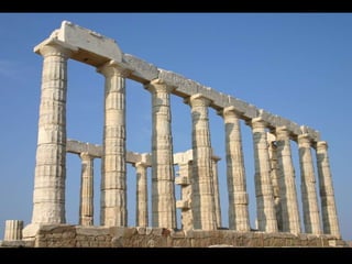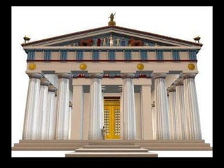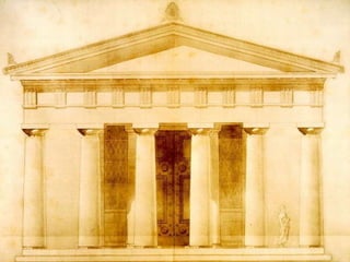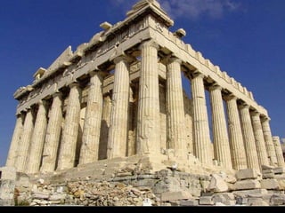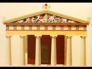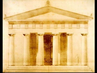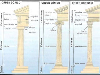 El documento describe la arquitectura egipcia y griega antigua. Los egipcios construyeron grandes pirámides y templos que simbolizaban durabilidad. Los griegos desarrollaron los órdenes arquitectónicos (dórico, jónico y corintio) basados en proporciones humanas y matemáticas, buscando belleza y perfección. Crearon diferentes estructuras como templos, teatros y ágoras siguiendo principios de simetría, equilibrio y armonía.