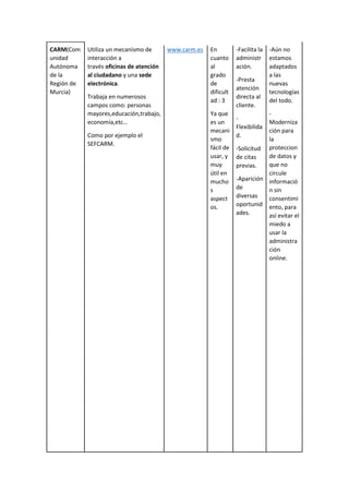 El documento describe el concepto de e-government y sus beneficios para los ciudadanos. El e-government hace referencia al uso de las tecnologías de la información por parte de las administraciones públicas para mejorar los servicios a los ciudadanos y la participación democrática. Entre las ventajas se encuentran la disponibilidad flexible de los servicios, el ahorro de tiempo y costes, y una mejor calidad del servicio. Varias instituciones de la Región de Murcia como el CARM, IMAS, DGT y la Biblioteca Regional utilizan portales electrónicos