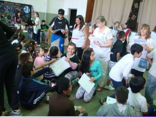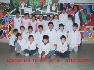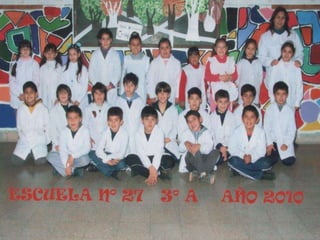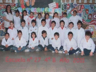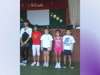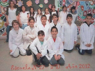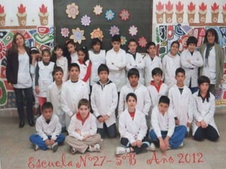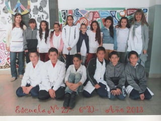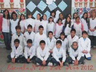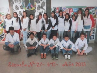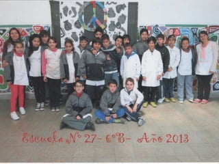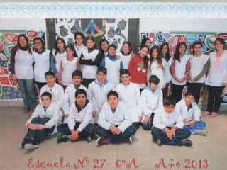 El documento habla sobre los egresados de 2013 de la Escuela Primaria No 27. Menciona los recuerdos de los primeros años en la escuela, las visitas realizadas a la Feria del Libro y a la Biblioteca del Niño, actividades como ajedrez y campamento. Finalmente expresa que fue un placer aprender y enseñar junto a los egresados y que los quieren y dejaron huella en la escuela y en los corazones.