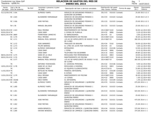 Este documento presenta una relación de gastos del mes de enero de 2014 para el Condominio Los Inkas Golf. Incluye más de 120 pagos realizados a proveedores y empleados por conceptos como mantenimiento de piscina, servicios de seguridad, limpieza, administración, suministros de oficina y gastos varios. Los pagos fueron realizados en efectivo y se detallan la fecha, número de documento, beneficiario, concepto, partida y monto de cada transacción.