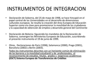 El documento describe varios instrumentos de integración europea en educación superior como la Declaración de Bolonia de 1999, que estableció un sistema de titulaciones de dos ciclos (pregrado y posgrado) y créditos transferibles. El objetivo es promover la movilidad de estudiantes y profesionales eliminando barreras entre sistemas. También se mencionan modelos de titulaciones, competencias deseables y debates sobre la implementación en países como España.