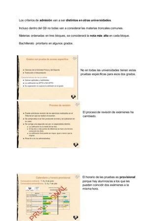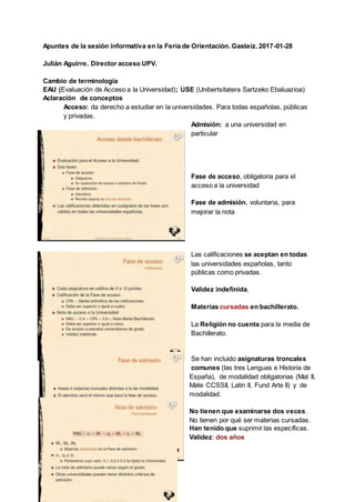 La sesión informativa explicó los cambios en la Evaluación de Acceso a la Universidad (EAU), ahora llamada Unibertsitatera Sartzeko Ebaluazioa (USE). La EAU da derecho al acceso a cualquier universidad española pública o privada, mientras que la admisión se refiere a una universidad en particular. La EAU considerará las asignaturas troncales comunes, obligatorias y de modalidad cursadas en bachillerato con validez indefinida. Los criterios de admisión pueden variar entre universidades e incl
