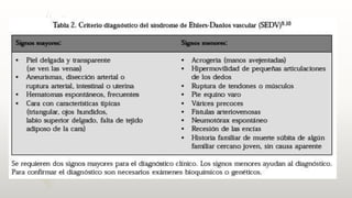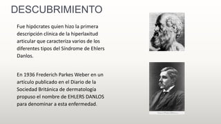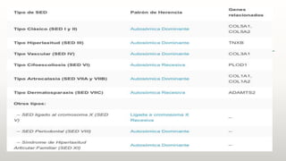 El síndrome de Ehlers-Danlos (SED) es un grupo de enfermedades que afectan el tejido conectivo y causan hiperlaxitud articular, piel hiperextensible y fragilidad de los tejidos. Los principales tipos son clásico, hiperlaxitud, vascular, cifoescoliosis y artrocalasia. Los síntomas incluyen dolor de espalda, piel suave y equimosis fácil. No tiene cura pero la fisioterapia puede aliviar los síntomas.