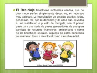 El reciclaje transforma materiales desechados en recursos valiosos. Incluye la recopilación, clasificación y procesamiento de materiales reciclables para convertirlos en materias primas y fabricar nuevos productos. Esto crea un ciclo que garantiza el éxito del reciclaje. Los beneficios incluyen la protección de empleos, la reducción de vertederos, el ahorro de energía y recursos naturales, y la disminución de la contaminación y el cambio climático.