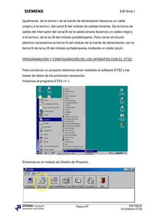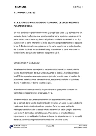 Este documento describe un proyecto para encender y apagar dos luces (A y B) mediante un pulsador doble utilizando el software ETS2. Se explican los pasos de configuración de la estructura del edificio, introducción de los aparatos (un pulsador doble y un módulo de salidas binarias), y parámetros de la programación para lograr el funcionamiento deseado.
