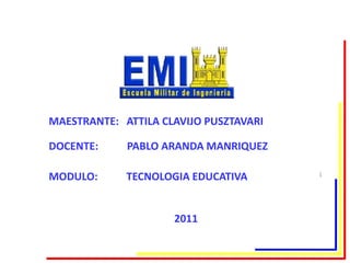 Este documento presenta información sobre un curso de tecnología educativa dictado en una escuela de idiomas. Incluye detalles sobre el maestrante, docente, módulo, carga horaria de 3 horas diarias de lunes a viernes para un total de 55 horas mensuales, el calendario escolar y el costo de $us 250 mensuales. También resume los beneficios del curso como libros técnicos, preparación para becas y instructores calificados.