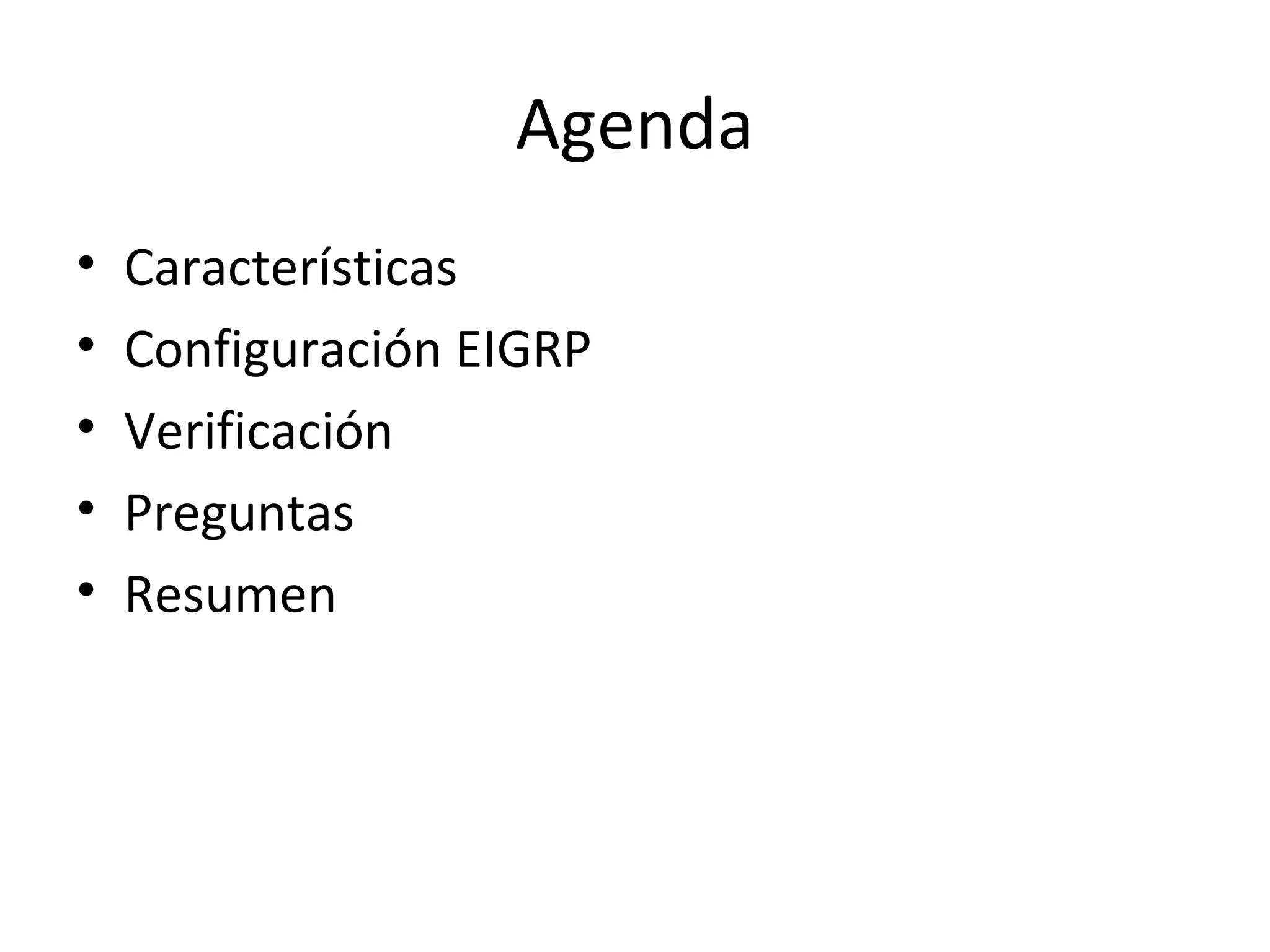 Este documento proporciona información sobre el protocolo de enrutamiento EIGRP, incluyendo sus características, configuración y verificación. Explica que EIGRP es un protocolo de enrutamiento propietario de Cisco que proporciona una convergencia rápida y actualizaciones parciales mediante el uso de tablas de vecinos, topología y unicast/multicast. Además, detalla los pasos para configurar EIGRP como habilitarlo en el router, declarar redes pertenecientes y habilitar registro de cambios