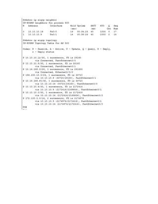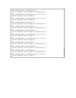 El documento presenta los comandos de configuración y verificación para EIGRP en routers. Incluye comandos como enable, ip address, router eigrp, network, show ip route, show ip interface brief, show running-config, show eigrp neighbor, entre otros. El documento también lista las direcciones IP y máscaras de las interfaces de los routers y las direcciones de las PC conectadas a la red.