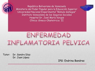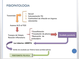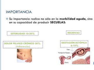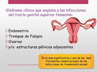 Este documento trata sobre el síndrome de enfermedad pélvica inflamatoria (EPI), la cual engloba las infecciones del tracto genital superior femenino. La EPI es una de las complicaciones más frecuentes de las infecciones de transmisión sexual. Describe los factores de riesgo, síntomas, diagnóstico, tratamiento y prevención de esta afección ginecológica común.