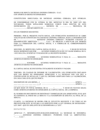 Este documento constituye la minuta para formar una sociedad anónima cerrada (S.A.C.) en Perú. Detalla los aportes de bienes no monetarios de los socios fundadores, el capital social suscrito, los estatutos de la compañía incluyendo su objeto, órganos de gobierno y facultades del gerente general. Finalmente designa al gerente general y subgerente e incluye una declaración jurada de recepción de los bienes aportados.