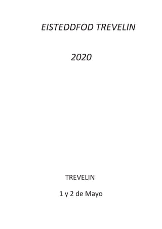 Este documento proporciona información sobre el Eisteddfod de Trevelin 2020, un festival cultural que se llevará a cabo del 1 al 2 de mayo en Trevelin, Argentina. Incluirá competiciones de literatura, música, danza y artesanías. Se celebrará en galés tradiciones que se remontan a los primeros colonos galeses que llegaron a la Patagonia en 1865. La comisión organizadora invita a todos los interesados a participar o asistir a este evento para disfrutar de la cultura galesa.