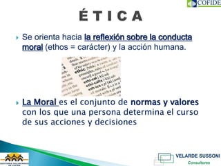 Julia Velarde Sussoni presenta sus credenciales como ingeniera industrial y MBA con un doctorado en administración. El documento discute la importancia de la ética y los valores en las empresas para generar organizaciones socialmente responsables, lo que permite lealtad de los empleados, mejor clima laboral, fidelización de clientes y ser más competitivo.