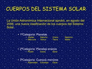 El documento resume la clasificación de los cuerpos del sistema solar según la UAI, incluyendo planetas (8), planetas enanos (3) y cuerpos menores. Describe brevemente a cada planeta, destacando sus características como tamaño, composición, satélites y temperaturas. También incluye una tabla con la distancia y periodo de revolución de los planetas.