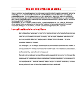El documento describe la experiencia del déjà vu, definida como sentir que se ha vivido previamente una situación nueva. El término fue acuñado por el investigador Emile Boirac basado en un ensayo escrito en la Universidad de Chicago. Aunque es común, es difícil de estudiar en laboratorio. Los científicos ofrecen varias explicaciones como que sea fruto de sueños diurnos, una alteración de la memoria que activa recuerdos erróneos, o un fallo en establecer la secuencia temporal de los hechos.