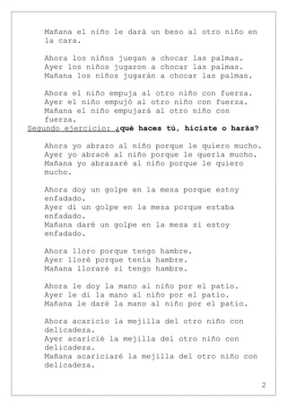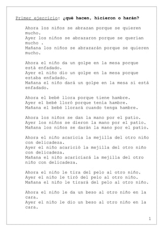 El documento presenta tres ejercicios en los que describe acciones que niños realizan, realizaron o realizarán en presente, pasado y futuro. El primer ejercicio se enfoca en acciones entre varios niños, el segundo cambia la perspectiva al hablante y el tercero repite el formato del primero pero enfocándose en casos donde hay un solo niño.