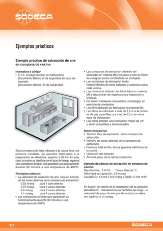 Este documento presenta tres ejemplos prácticos de sistemas de ventilación y extracción de aire requeridos por la normativa: 1) extracción de aire en aparcamientos, 2) extracción de aire en campanas de cocina, y 3) extracción de aire en viviendas. Describe los principios básicos, normativa aplicable y datos necesarios para cada caso, así como ejemplos de cálculo del caudal de aire.