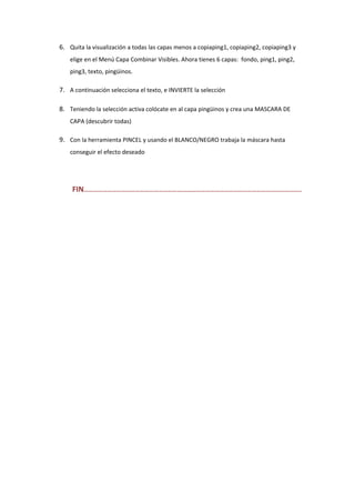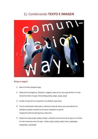 Este documento proporciona instrucciones en 7 pasos para combinar texto e imágenes en Photoshop. Primero se separan los pingüinos en capas individuales y se añade el texto. Luego se duplican las capas de pingüinos y se combinan con el texto. Finalmente, se crea una máscara de capa para revelar solo el texto a través de las capas de pingüinos.