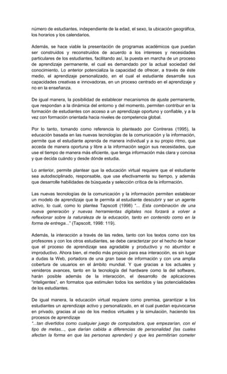 El documento describe las características y ventajas de la educación virtual, incluyendo que permite la comunicación a escala mundial, acceso flexible a programas académicos independientemente de ubicación, y aprendizaje personalizado centrado en el estudiante. También discute la importancia de desarrollar estrategias metacognitivas para apoyar el aprendizaje efectivo a través de medios virtuales.