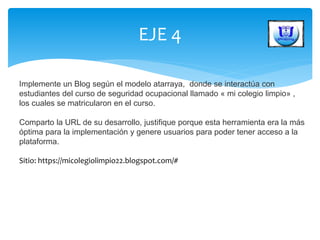Este documento describe la implementación de un blog interactivo llamado "Mi colegio limpio" para estudiantes de un curso de seguridad ocupacional en la Fundación Universitaria del Área Andina. El blog se usó como una herramienta didáctica innovadora para enseñar sobre el manejo adecuado de residuos sólidos y el cuidado del medio ambiente de una manera divertida e interactiva. El blog permitió a los estudiantes y profesores interactuar fuera del aula a través de videos, actividades, foros y guías de apre