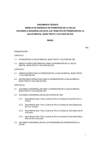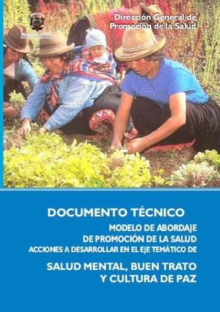 Este documento técnico presenta orientaciones para promover la salud mental, el buen trato y la cultura de paz en el Perú. Describe la situación actual de estos temas según etapas de vida y ofrece un marco teórico basado en el desarrollo humano. Propone acciones para estos temas en programas de promoción de la salud dirigidos a familias, escuelas, comunidades y centros laborales.