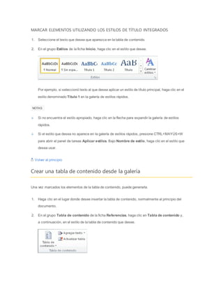 Las tablas de contenido en Microsoft Word se crean automáticamente al aplicar estilos de encabezado al texto y pueden actualizarse automáticamente si se realizan cambios en el documento. Se pueden generar tablas de contenido desde la galería de estilos o crear versiones personalizadas con opciones y estilos personalizados en el cuadro de diálogo Tabla de contenido.