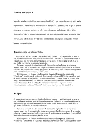El documento compara diferentes configuraciones de espaciado interlineal y entre párrafos. Describe cómo Panasonic ha desarrollado el primer grabador de DVD que permite almacenar programas de televisión y videos grabados en un formato DVD-RAM de 4.7 GB, aunque sólo admite entradas analógicas.